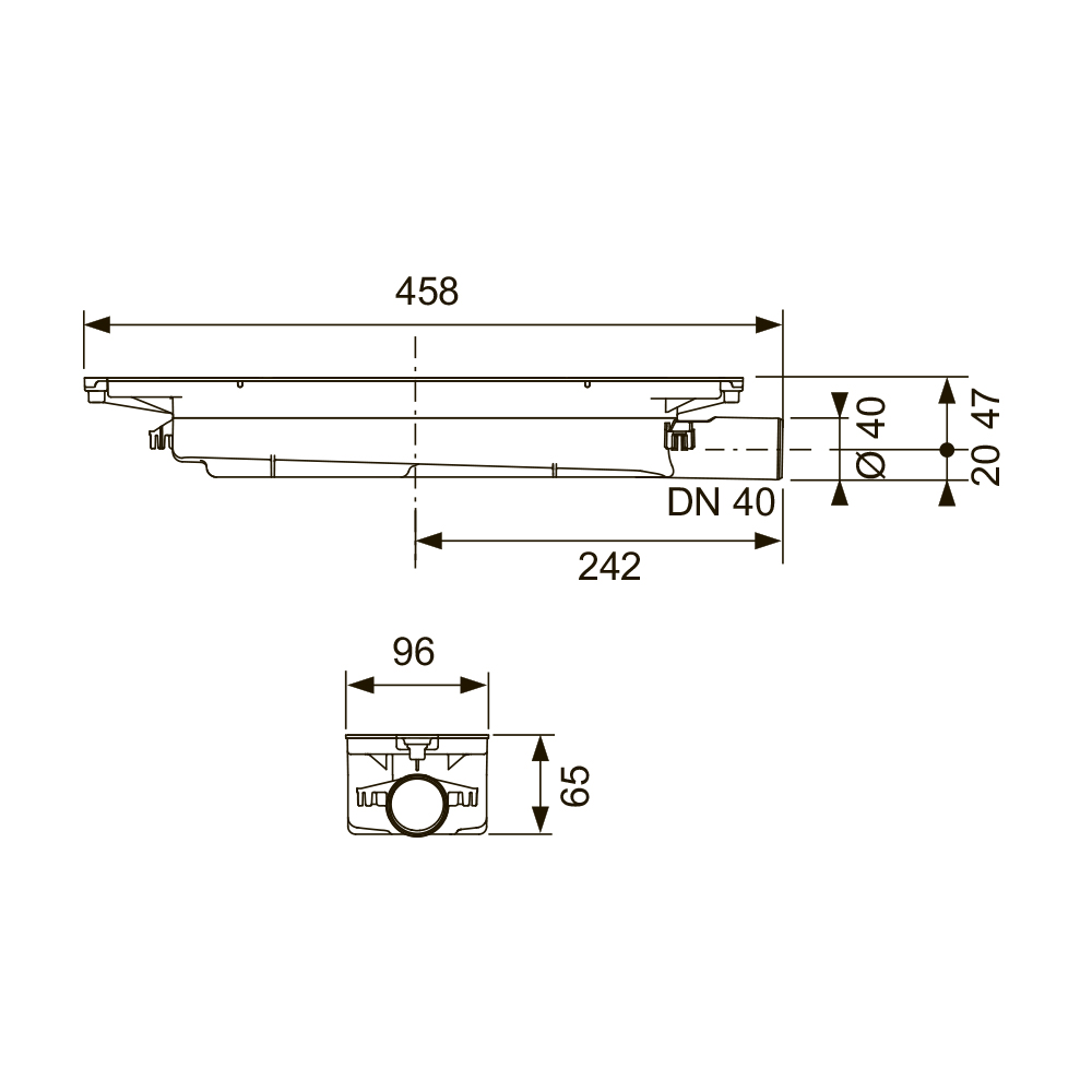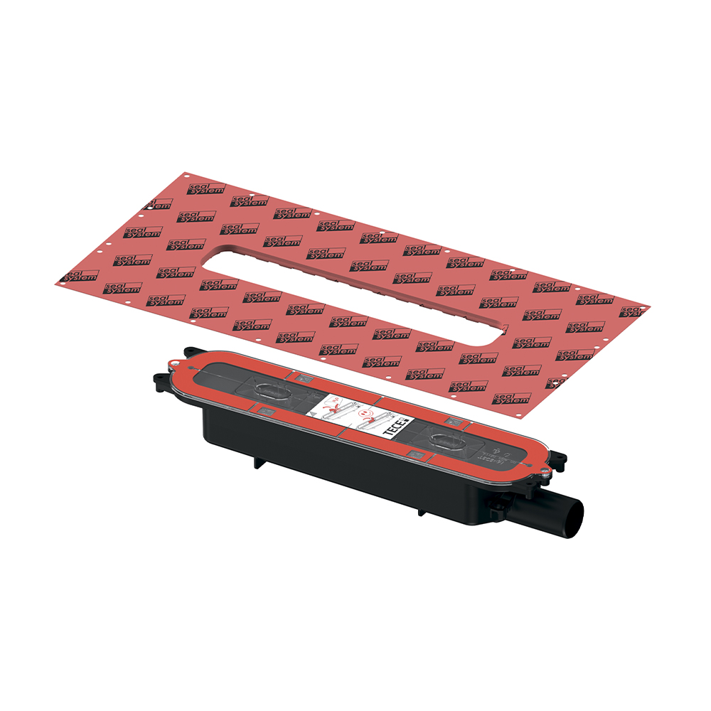 Сифон для душевого профиля TECEdrainprofile для установки в бетонной стяжке. Для горизонтального подсоединения канализационной трубы DN 40. Установленная на заводе гидроизоляционная манжета SealSystem с защелкой для монтажа в композитной гидроизоляции в соответствии с DIN 18534