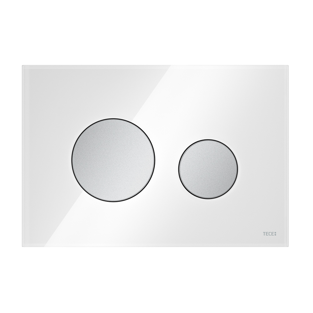 Панель смыва для смывных бачков TECE, фронтальная или верхняя установка. Плоская стеклянная панель смыва с двумя установленными на пружинах клавишами смыва. Подходит для монтажа на уровне стены вместе с монтажной рамкой унитаза (например арт. 9240649). Совместима с контейнером для гигиенических таблеток.