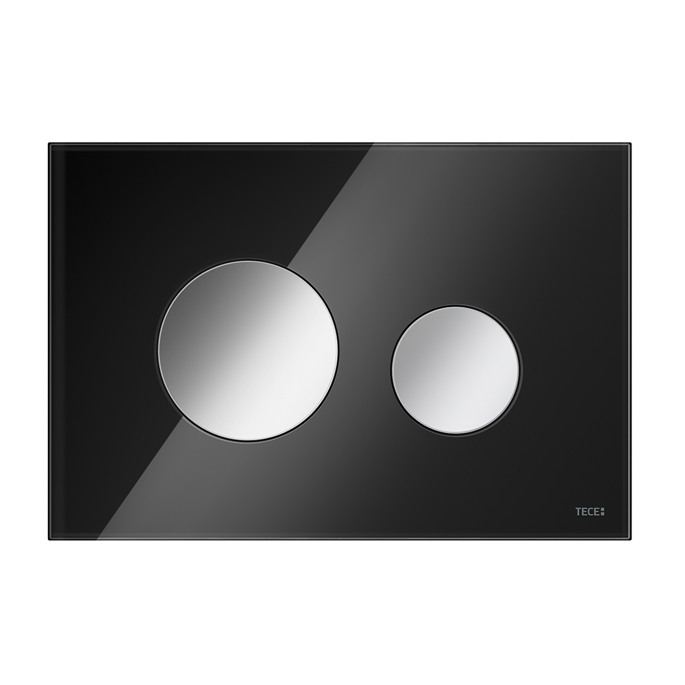 Панель смыва для смывных бачков TECE, фронтальная или верхняя установка. Плоская стеклянная панель смыва с двумя установленными на пружинах клавишами смыва. Подходит для монтажа на уровне стены вместе с монтажной рамкой унитаза (например арт. 9240649). Совместима с контейнером для гигиенических таблеток.