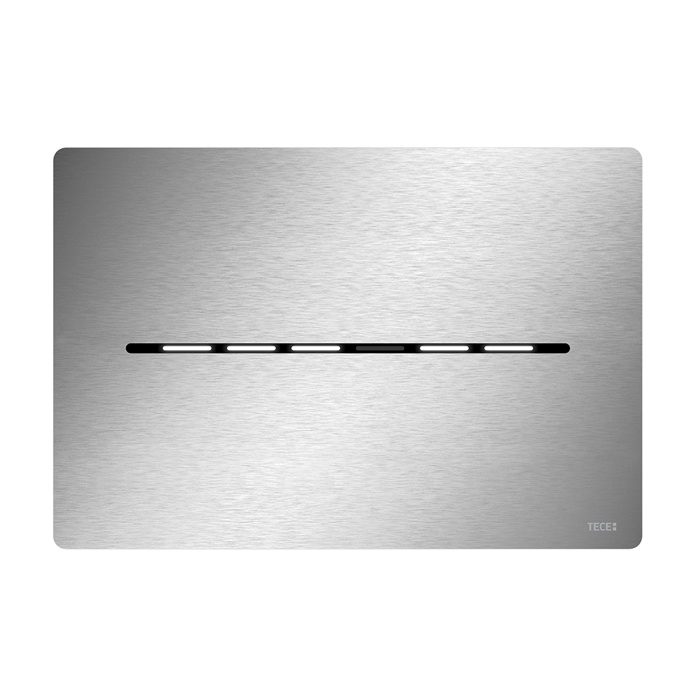 Электронная панель смыва с гигиеничной бесконтактной активацией смыва для стандартных бачков ТЕСЕ (глубиной 13 см) с фронтальной активацией и высотой высотой установки около 1 м (центр панели смыва). Плоская панель из нержавеющей стали в комплекте с крепежными элементами, герметичным отсеком для батарей для установки внутри бачка (4 батареи тип Mono/D/LR 20) и электроприводом смыва для систем двойного смыва. Совместима с контейнером для гигиенических таблеток.
