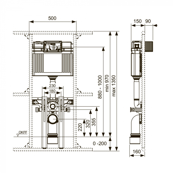 - Поперечная пластина для крепления шпилек унитаза (монтажное расстояние 180 или 230 мм)