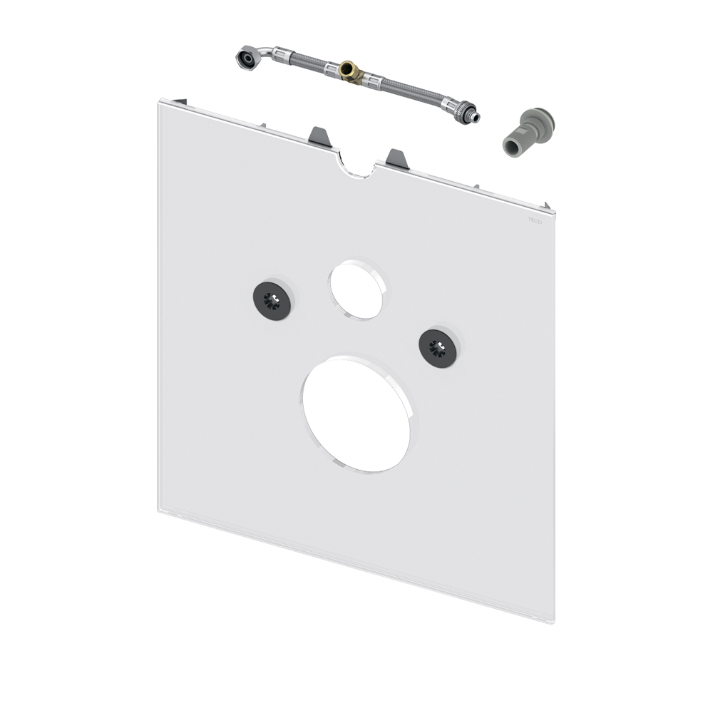 Нижняя стеклянная панель для установки сидений-биде TOTO Washlet GL и EK, Washlet Giovannoni, Villeroy & Boch Viclean U или Geberit Aquaclean 5000 и 5000 plus, в комплекте со звукоизолирующей прокладкой и отводом для подключения воды внутри бачка.